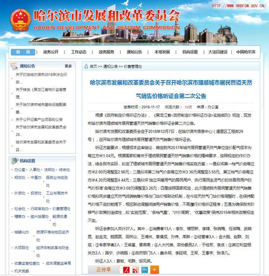哈尔滨市发展和改革委员会定于 2018年12月7日, 在哈尔滨市信息中心(道里区工程街29号)召开 哈尔滨市理顺城市居民管道天然气销售价格听证会。