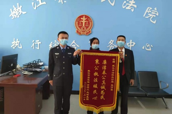 1月5日,一名案件当事人专程来到嫩江法院表示感谢,将印有“廉洁奉公真诚为民 秉公执法暖人心”的红色锦旗送到执行局干警张万春的手中,锦旗上承载着当事人对法院的赞誉和感谢之情。