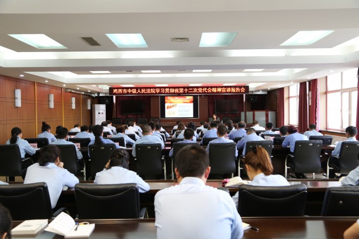 为更好地学习贯彻省十二次党代会精神,引导全院干警把思想和行动统一到省党代会精神上来,把智慧和力量凝聚到新一届省委提出的战略任务上来,进一步推进全市“转型发展兴市富民”步伐,按照市委的统一部署,6月7日下午,鸡西市中级人民法院举办了学习贯彻省第十二次党代会精神宣讲报告会。邀请市委宣讲团成员、市委讲师团理论研究室主任,副教授,黑龙江大学哲学硕士贾莉莉主讲。会议由党组副书记、副院长、机关党委书记李锋主持,全体党员参加。