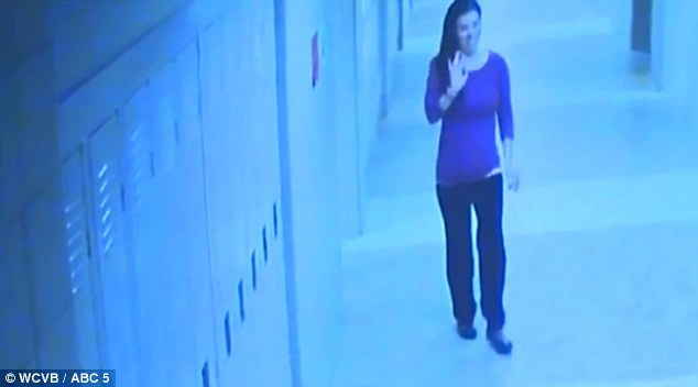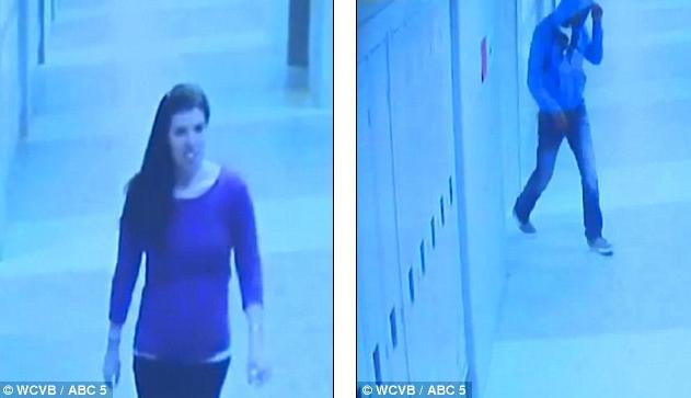 2013年10月,这名少年尾随准备帮他补课的24岁数学老师Ritzer进入卫生间,然后将其强奸并割喉杀害,还抢走了被害人的银行卡、信用卡和手机。调查人员不清楚少年为啥要杀害数学老师。图为事发当天监控录像,被害人Ritzer独自走在学校走廊里。