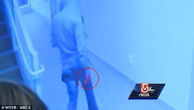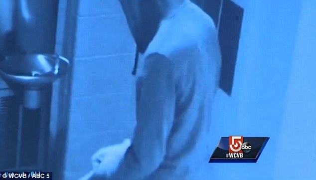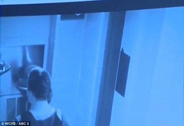 图为可以看到一个女学生走进卫生间,但是她很快就出来了。检察官曾解释说,女孩当时看到了男性的裸露的臀部,但她咯咯笑着离开了,因为她认为别人正在整理衣服。