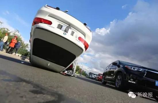 昨天下午1点半,在公路大桥江南往江北方向下桥口附近路段,一辆宝马轿车追尾一辆尼桑轿车后倒扣路中央。