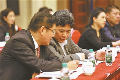 全国人大代表、中国烟草实业发展中心党组成员、副总经理王殿贵(左)提出,司法应靠前为企业发展服务。