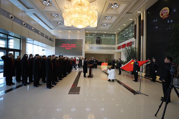 面对庄严的国旗和国徽,全体宣誓人员站立整齐、高举右手,党组成员、副院长、三级高级法官顾双彦手抚宪法宣誓本,领颂誓词:“我宣誓:忠于中华人民共和国宪法,维护宪法权威,履行法定职责,忠于祖国、忠于人民,恪尽职守、廉洁奉公,接受人民监督,为建设富强民主文明和谐美丽的社会主义现代化强国努力奋斗!” 面对神圣的国旗和国徽,全体宣誓人员身穿法袍、整齐列队,高举右手,跟随领誓人向宪法立下庄严的承诺。