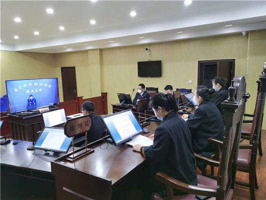 技术人员提前对仪器调试、消毒后,庭审正式开始。三位法官、一位书记员、两位公诉人在法院庭审现场,与在鸡西看守所视频提讯室的被告人视频连线对话,全程画面清晰,交流顺畅。密山法院线上刑审第一案顺利完成。