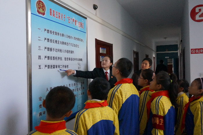 寒假第一天,富区法院邀请了辖区共建学校幸福小学的同学们走进法院,零距离感受了法院独特的法治文化和工作氛围。在法官阿姨的引导下,同学们走进法院,参观了法院诉讼服务中心、审判法庭等场所,法官阿姨为同学们介绍了人民法院的工作职责,讲解了法徽、法袍、法槌的意义,并结合审判工作实际教育同学们要学法、知法、懂法、守法,运用法律知识来保护自己。活动中,富区法院为同学们播放了法律宣传片,组织同学们走上审判台,与法官阿姨组成“合议庭”,敲响法槌,真实的感受到法律的庄严和神圣。学生们通过具体参与扮演庭审的各个角色,切身感受到了法律的严肃和神圣,激发了同学们学习法律知识的兴趣,增强了法律意识。