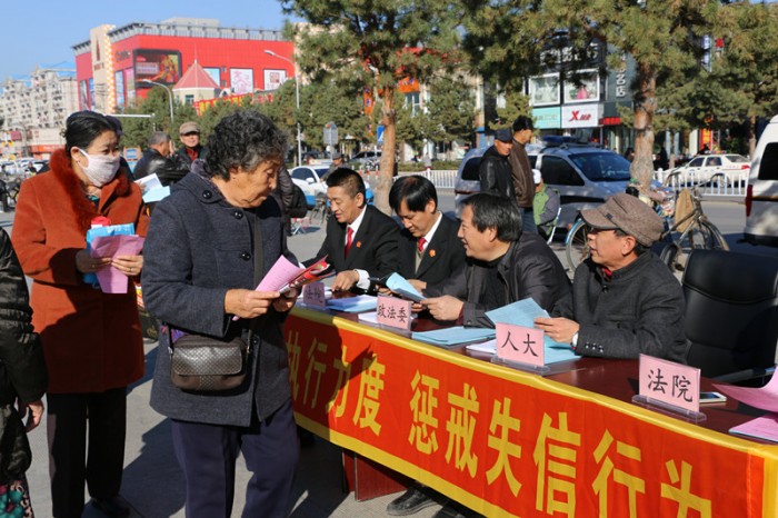 活动现场,该院执行干警在富裕县海华广场前张贴了宣传标语,向群众发放《“老赖”招投标活动将受限制》、《联合惩戒“老赖”都有哪些招》、《富裕县人民法院致广大人民群众的一封信》等宣传材料1500余份,和群众互动答疑210余人次。活动前法院还通过微信、网络等方式公布了第三批失信被执行人名单,并对执行工作动态、失信后果等进行了宣传。