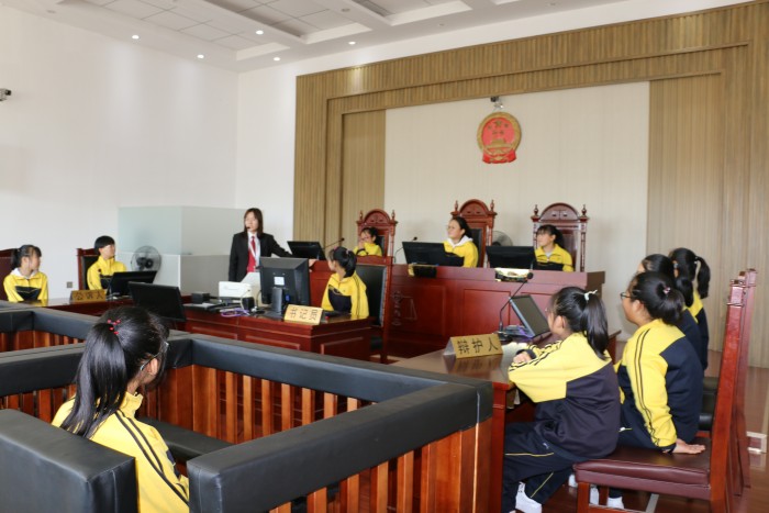 在诉讼大厅,工作人员带领同学们参观法院诉讼服务中心,向大家介绍法院的历史沿革、机构设置及法院文化,并用现场操作演示的方式介绍法院诉讼服务中心的职能、法院的立案流程等;在文化长廊,大家了解到了内容丰富的法官发展史和典型案例,感受着法院厚重而独特的文化氛围;在执行指挥中心,同学们通过工作人员的演示和介绍,对现代化大数据的工作和办案方式感到震撼;在审判法庭,同学们了解审判法庭的组成人员以及整个法庭的格局布置、法庭审判的步骤和程序后,先后提出了自己的问题。同学们纷纷走上审判台,敲响法槌进行职业体验,当起了“小法官”,切身感受法庭的神圣和庄严。