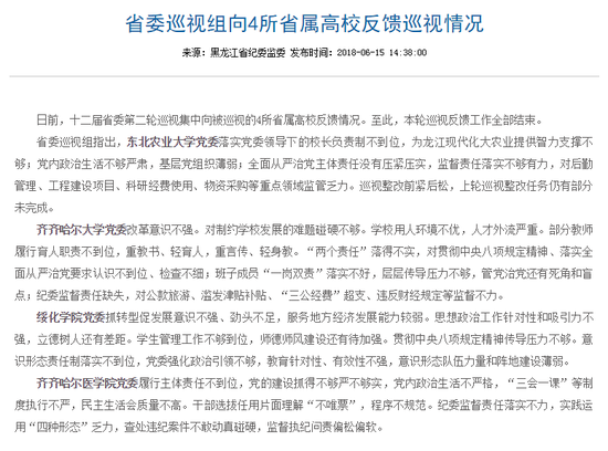 省委巡视组指出,东北农业大学党委落实党委领导下的校长负责制不到位,为龙江现代化大农业提供智力支撑不够;党内政治生活不够严肃,基层党组织薄弱;全面从严治党主体责任没有压紧压实,监督责任落实不够有力,对后勤管理、工程建设项目、科研经费使用、物资采购等重点领域监管乏力。巡视整改前紧后松,上轮巡视整改任务仍有部分未完成。