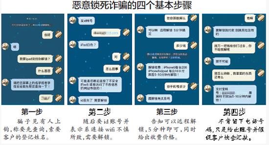 恶意锁死诈骗的四个基本步骤10月7日,“果粉”小志(化名)的iPad被人恶意锁死,为解锁,他差点上了当。