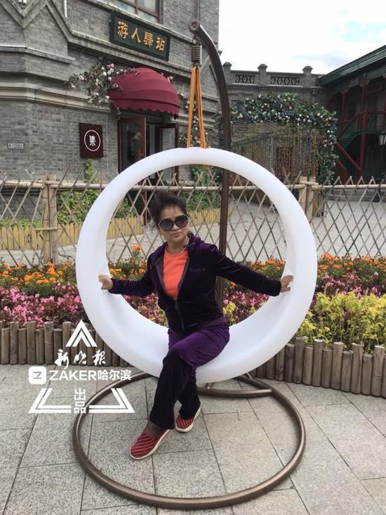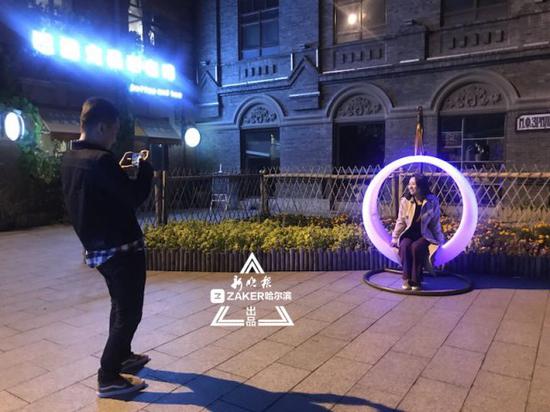 " 咔嚓,咔嚓 ",王阿姨家住附近,饭后总喜欢到中华巴洛克街区走走。看见大院里来了闪着光亮、下方形似弯月的秋千,她特意摆好造型,让老伴儿给拍了好多美照。