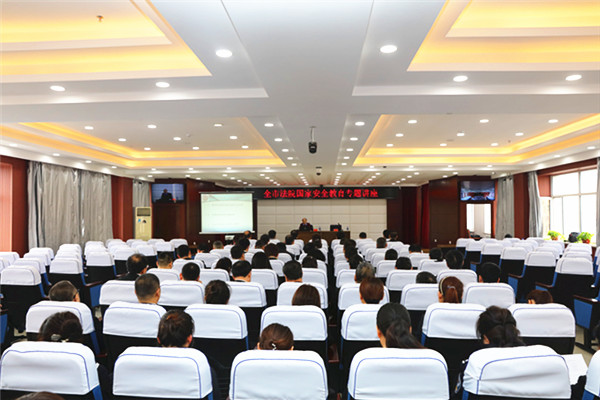 讲座中,戴玉胜从落实总体国家安全观的主要内容、当前国家安全领域面临的形势和习近平总书记的重要指示精神三个方面,结合法院的工作特点和国家、省、市发生的实际案例进行讲授。戴玉胜表示,国家安全意义重大,形势复杂,与每个人息息相关,希望大家能提高思想认识和忧患意识,共同维护国家安全。