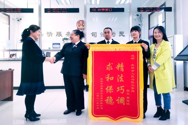 2021年10月18日,当事人虎林市永富农业发展有限公司工作人员将写着“求和保稳、精法巧调”和“耐心调解、为民服务”的两面锦旗送到虎林法院调解员手中,以表达感激之情。