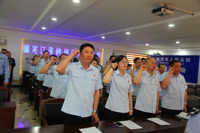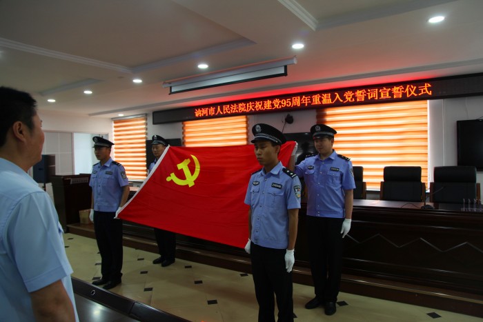 为进一步推动讷河市人民法院“两学一做”学习教育活动,增强党组织的凝聚力和战斗力,激励党员坚定爱党、信党、跟党走的理想信念。6月22日,讷河市人民法院党支部组织全院党员开展了重温入党誓词活动。