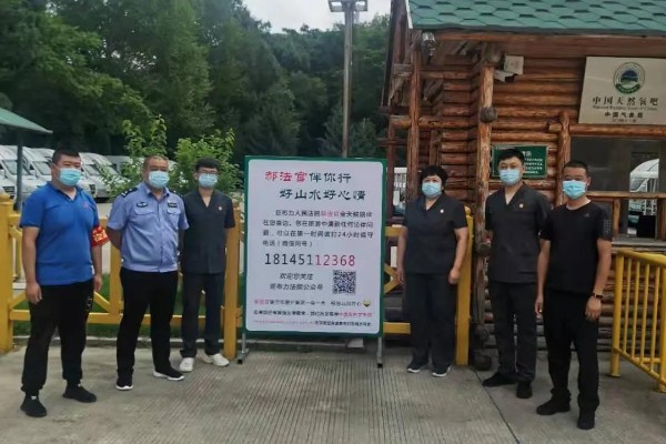在凤凰山国家地质公园,一些参观路线的显著位置上,都有黑龙江省亚布力法院设置的标识牌:“郝法官伴你行,好山水好心情”,上面公布了24小时值班热线电话、微信。