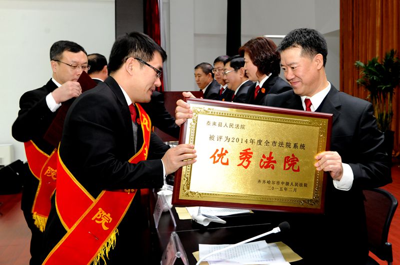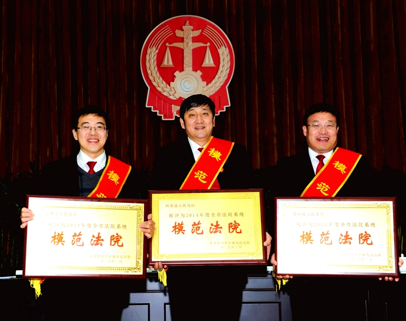 为褒奖先进、激励队伍、鼓舞士气、促进工作,中院决定授予拜泉县人民法院、富裕县人民法院、铁锋区人民法院“模范法院”荣誉称号。授予碾子山区人民法院、龙江县人民法院、甘南县人民法院、泰来县人民法院、富拉尔基区人民法院为2014年度法院工作“优秀法院”荣誉称号。对在2014年度涉诉信访工作中做出突出成绩的富裕县人民法院、拜泉县人民法院、铁锋区人民法院授予“2014年度全市法院涉诉信访工作模范法院”荣誉称号。授予碾子山区人民法院、梅里斯区人民法院、依安县人民法院、建华区人民法院、富拉尔基区人民法院、讷河市人民法院“2014年度全市法院涉诉信访工作优秀法院”荣誉称号。授予齐齐哈尔市中级人民法院立案二庭等12个庭室 “模范庭室”荣誉称号。授予铁锋区人民法院办公室等7个庭室 “先进集体”荣誉称号。授予齐齐哈尔市中级人民法院民二庭、法警支队、执行局指挥中心“2014年度中院机关涉诉信访工作先进集体”荣誉称号。授予王亚明等40名同志“优秀法官”荣誉称号。授予何米罗等23名同志“先进个人”荣誉称号。授予许辉等38名同志“2014年度全市法院涉诉信访工作先进个人”荣誉称号。授予左齐等12名同志“办案标兵”荣誉称号;授予戚丽英等13名同志“调解能手”荣誉称号。