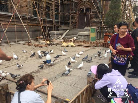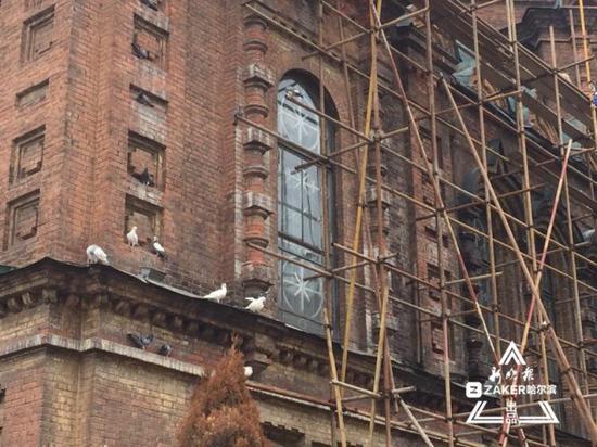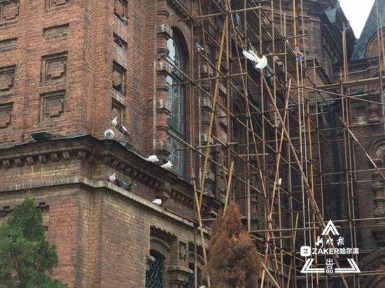 26 日,记者来到建筑艺术广场,老教堂周边已经设立了围档,教堂周边立起了脚手架。原本只在教堂南方的小广场与游客亲近的小鸽子,有几只似乎迷路了,它们在教堂北面溜达,有小朋友想跟它们亲近,它们也不太理人。