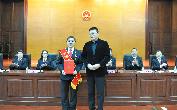 哈尔滨市委常委、政法委书记王小溪为“全国模范法官”刘墨莲颁奖