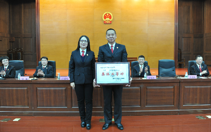 省法院副厅级审判员、政治部副主任吕爱哲为哈尔滨中院颁发“信息化建设‘二等功’”荣誉奖状。