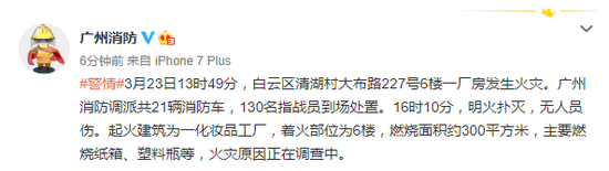 新京报快讯 据广州消防官方微博消息,3月23日13时49分,白云区清湖村大布路227号6楼一厂房发生火灾。广州消防调派共21辆消防车,130名指战员到场处置。16时10分,明火扑灭,无人员伤。起火建筑为一化妆品工厂,着火部位为6楼,燃烧面积约300平方米,主要燃烧纸箱、塑料瓶等,火灾原因正在调查中。