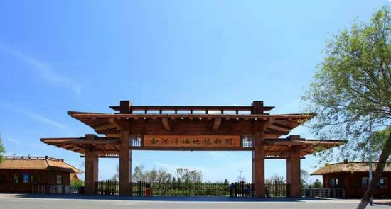 金河湾湿地公园于 2011 年 6 月 5 日正式开园。位于松北区江湾路 5000 号,园区分为一岛、二滩、三岗、四园、五池、六洲六大功能区。园中种植了落叶松、桑树、山丁子和山里红等万余株灌木和乔木,以及莲花、塔头等多种花草。