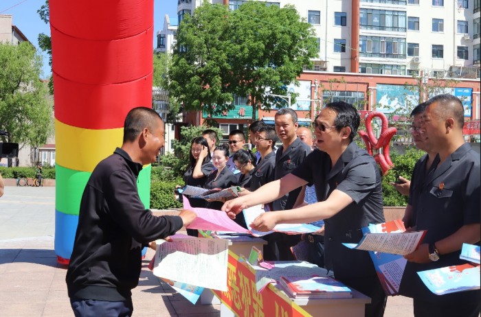 6月4日9时,双鸭山宝山法区院组织全体干警在宝山区八一广场开展以“强化审判职能,重拳出击、精准发力,坚决打赢扫黑除恶‘百日攻坚战’”为主题的扫黑除恶专项斗争集中宣传活动。