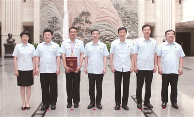 图为周强、沈德咏、徐家新、张述元等领导与“时代楷模”孙波合影。 曹颖逊 摄