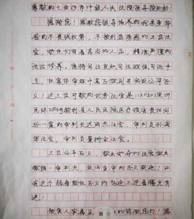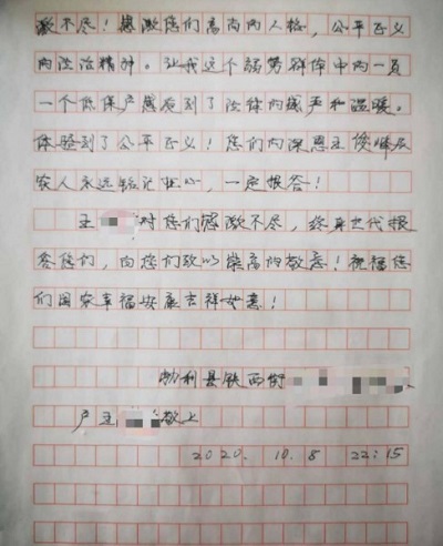 感谢信中朴实的话语透出最真挚的情感,一封手写的感谢信也道出了一个普通百姓的真实心声,也是对法官最好的鼓励,更让法官深知肩上的使命和责任,在今后的工作中更加牢固树立让人民群众在每一起案件中感受公平正义的目标。