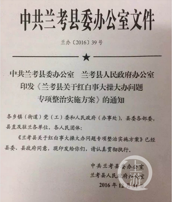 图说:兰考县委县政府印发的《兰考县关于红白喜事大操大办问题专项整治实施方案》。