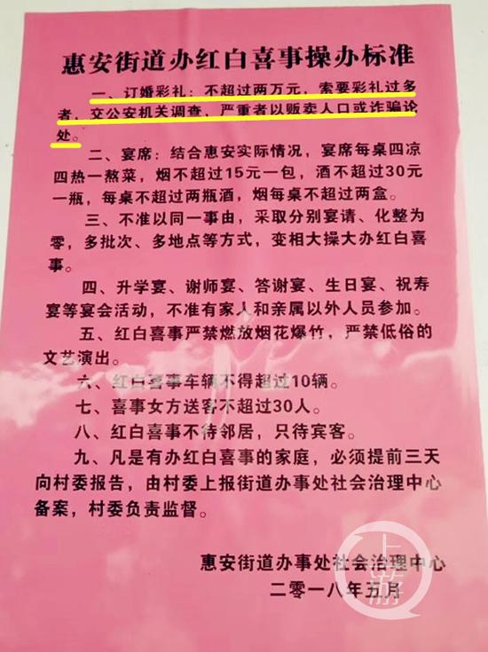 这两天,一份红纸黑字的《惠安街道办红白喜事操办标准》在网上引起热议,该标准第一条规定:索要彩礼“严重者”以贩卖人口或诈骗论处。