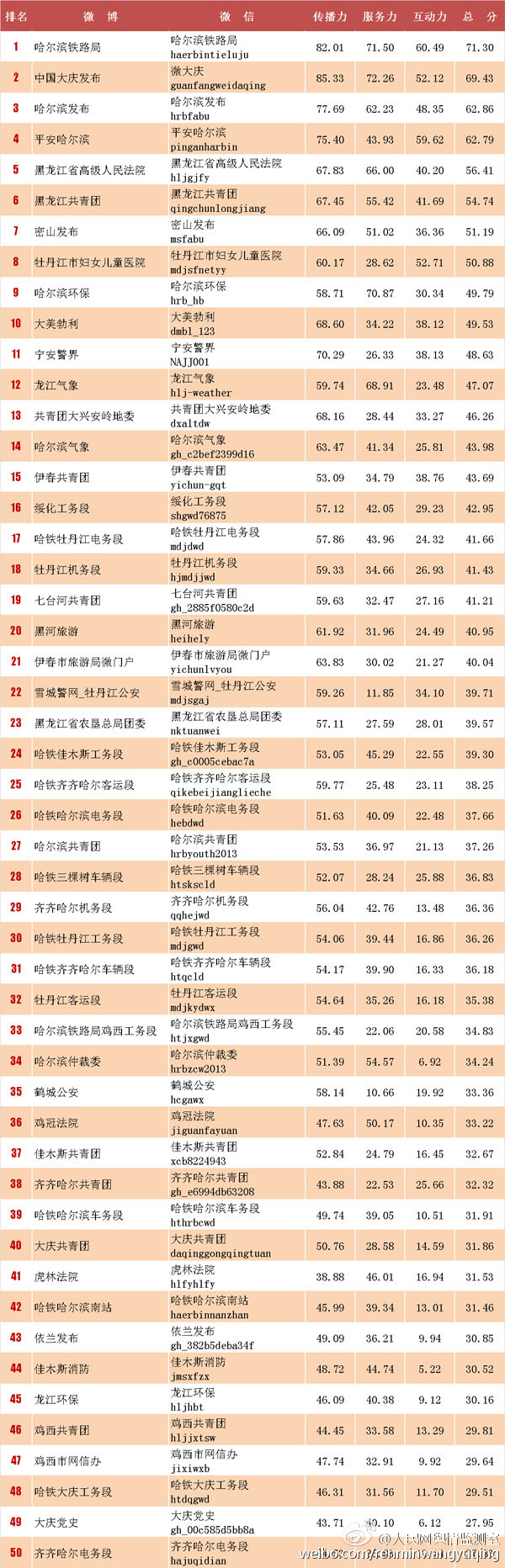 2015年7月20日,黑龙江省委网信办、人民网黑龙江频道在哈尔滨市举办的黑龙江省优化网络环境高峰论坛暨“网络大V龙江行”活动,人民网舆情监测室秘书长祝华新公布了黑龙江省政务“两微”榜单,省高级人民法院“双微”排名第五。