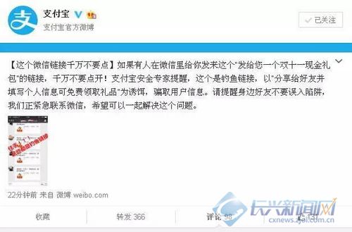 本报讯(记者石岩松)日前,支付宝通过官方微博提醒用户,如果有人在微信里给你发来这个“发给您一个双十一现金礼包”的链接,千万不要点开。省公安厅刑侦总队发布消息提示,“双十一”将至,一些钓鱼网站搭着“双十一”的顺风车,花样百出的钓鱼链接、来历不明的中奖短信,大家一定要注意预防。
