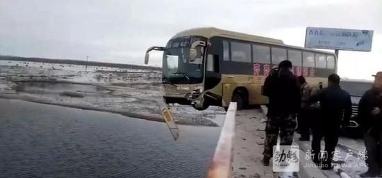 惊险!齐齐哈尔大巴冲出桥栏 车身一半悬空在外(图)