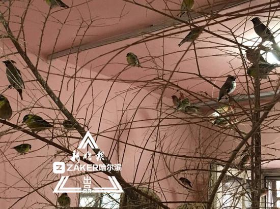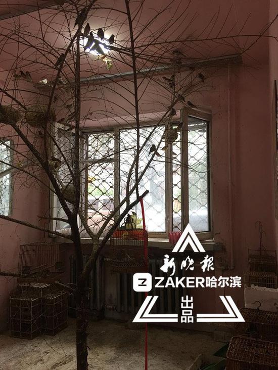 家住南岗公司街某小区的王先生自幼喜欢鸟,这些可爱的小家伙在他眼里就是精灵。以前尽管他住楼房没地方养,但鸟笼挂在阳台也是密密麻麻,养鸟爱鸟 16 年,他一直觉得不过瘾,正好今年他在小区的门头房到期,他索性留下来不租,宁可 3 万房钱不挣,也特意给鸟儿腾出一间卧室当别墅。记者在 “ 鸟儿别墅 ” 看到,近 10 余平方米的房间,王先生把它打造成了鸟语林——一棵天然树固定在房中央,营造成大自然的状态,偌大的空间,任鸟儿在 “ 树上 ” 飞翔穿梭,跳来跳去。指着树杈上的鸟巢,王先生说,每个巢里都有鸟宝宝,一个巢就是一个甜美的小家庭,对自己的宝贝儿们,鸟妈鸟爸也都尽职尽责,鸟爸看护宝宝安全,守在巢旁防止外侵,鸟妈则一心喂养宝宝长大。满屋子的小鸟,各自有自己的鸟语叫声,王先生说 “ 看着它们就喜欢 ”。他说,这里有上百只鸟,有百灵、画眉等十多个品种,一天的鸟食就得半袋子!夏天热,还要随时送水,有的鸟还要特意单独挂到树上让它们去欣赏风景 …… 虽然照顾它们也很辛苦,但这些小家伙们清脆的鸣叫悦耳动听,能扫去他所有的烦恼。