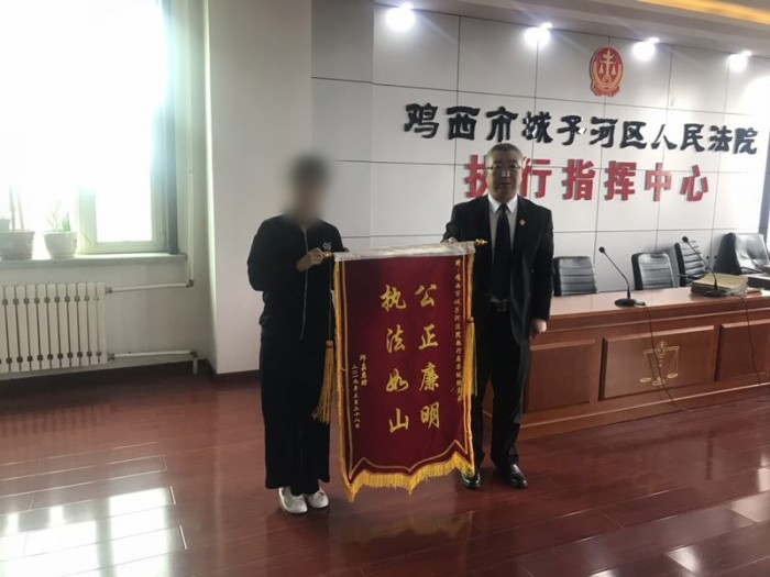 近日,申请执行人邱某惠和母亲董某来到鸡西市城子河区法院,送上写有“公正廉明 执法如山”、“公正执法 一心为民”的两面锦旗,以表达对执行干警的感激之情。