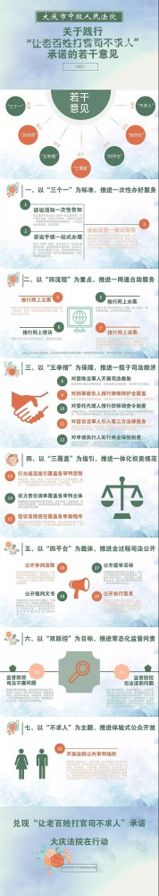 为践行“让老百姓打官司不求人”的承诺,加强和改进为民司法、公正司法、阳光司法举措,最大限度赢得人民群众对法院的信赖、对法官的信任、对司法的信服,切实优化法治化营商环境,大庆中院党组书记、院长洛大雨带领院党组经多次研究,出台《关于践行“让老百姓打官司不求人”承诺的若干意见》,从7个方面推出22项措施。