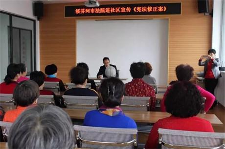 4月11日,绥芬河法院刑事审判庭法官助理周长寿深入新兴社区,为社区居民讲解《宪法修正案》内容。向居民宣传宪法知识,增强居民学习宪法、崇尚宪法的意识,进一步提高了居民履行法定义务、维护合法权益的自觉性和能力。