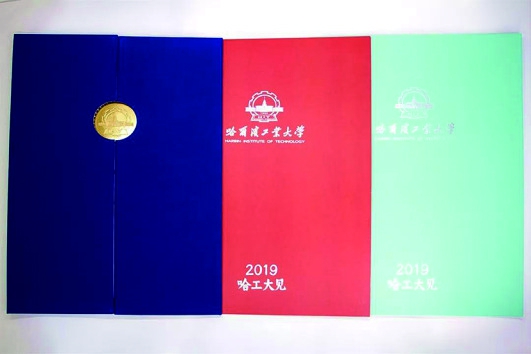 据哈工大本科招生办的老师介绍,哈工大今年重新设计了录取通知书,新版通知书的主题为“开·启”,由深蓝、浅蓝和红色三种颜色组成,分别象征校本部、威海校区和深圳校区。通知书的背景图案由理工科的元素构成,如航天、机器人、计算机、生命科学等,体现了哈工大的优势学科。