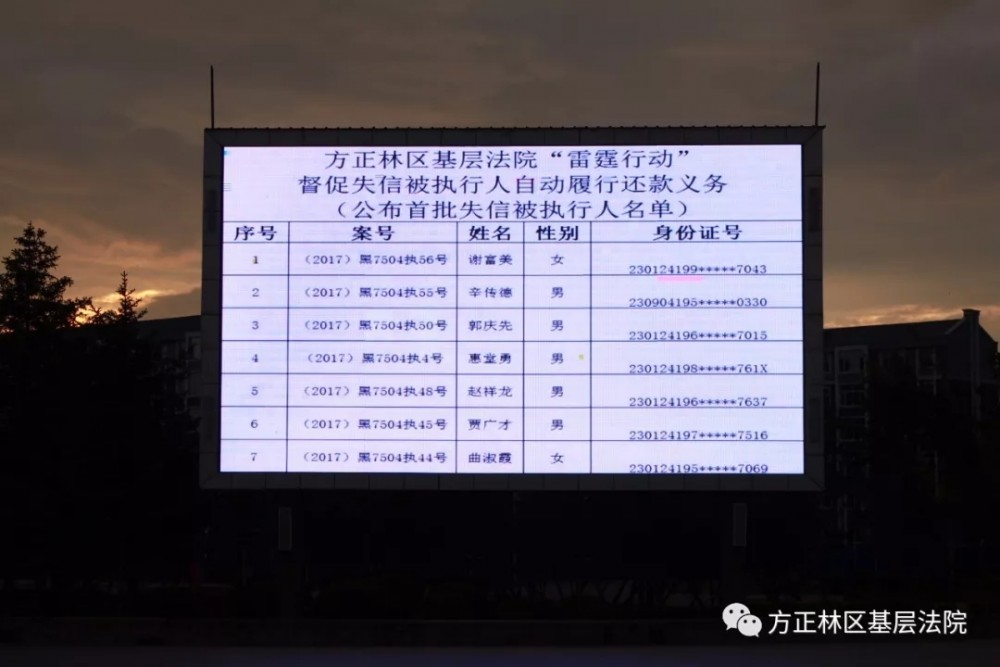 在方正林区文化广场LED显示屏上,一组组失信被执行人的图片信息吸引了很多前来在广场散步的群众关注,这是方正林区基层法院为落实“雷霆行动”破解执行难放出的“大招”。