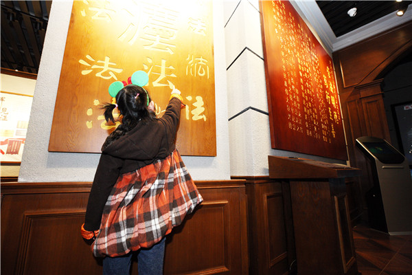 在院史馆里,孩子们被可以翻动的电子书、三维全息投影、3D纱幔深深吸引住了,天真的眼睛里闪烁着喜悦的光芒,孩子们纷纷嚷道:“这里真是太好了!”还有一个女孩,踮起脚尖,小心翼翼的抚摸着院史馆展板上镌刻的“法”字。