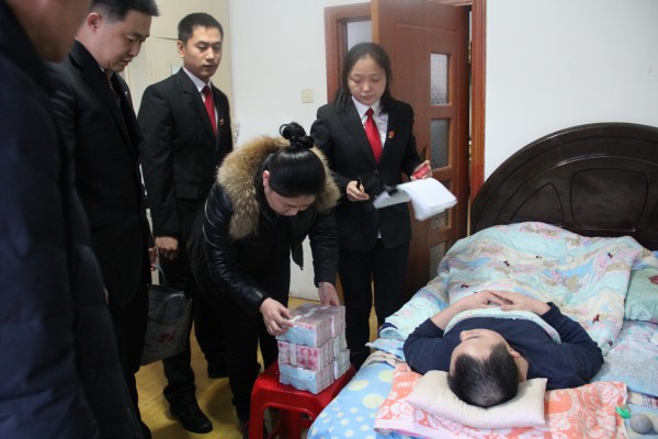 1月4日下午,农历腊八节前夕,南山区法院执行局干警一行五人在执行局局长范伟平的带领下,将50万元现金执行款送到了瘫痪在床的申请执行人王某家中,用行动诠释了执行干警司法为民的情怀。