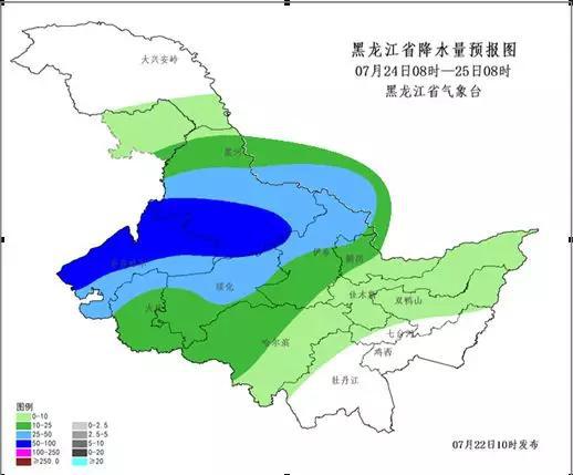 24日:黑河南部、伊春北部、齐齐哈尔、绥化北部有大雨(降水量25~50毫米),其中黑河南部、齐齐哈尔部分地区有暴雨(降水量50~80毫米);黑河北部、伊春南部、大庆、绥化南部、哈尔滨西部有中雨(图1)。