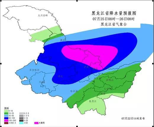 25日:黑河、伊春、鹤岗、绥化北部、哈尔滨西部有暴雨(降水量50~100毫米),其中黑河东部、伊春北部、鹤岗局地有大暴雨(降水量100~150毫米);齐齐哈尔、大庆、绥化南部、佳木斯西部大雨。(图2)。