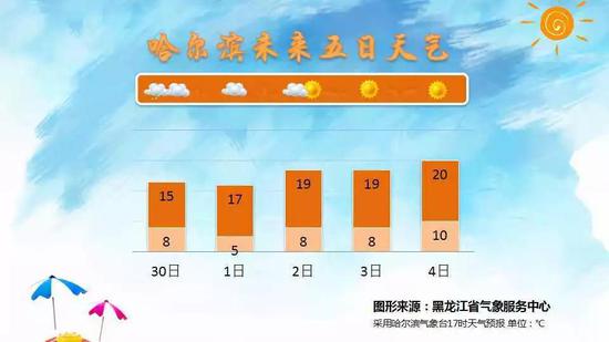 10月1-5日哈尔滨市天气晴好。今日开始受冷空气影响,哈尔滨市气温明显下降,10月2日气温显著回升,10月5日最高气温可达到21℃左右。另外,10月1日白天风力较大,平均风力可达3-4级,阵风4-5级,请注意防范。