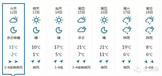 具体天气:12日多云转晴,偏西风3-4级,最高温10℃,最低温度-2℃;13日晴,最高温11℃;14日(周三)开始回暖,最高温17℃;周五气温有望重回“2”字头。