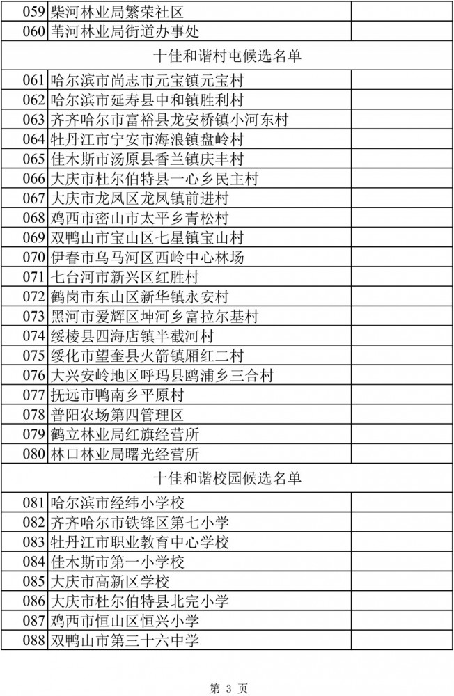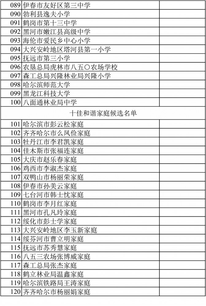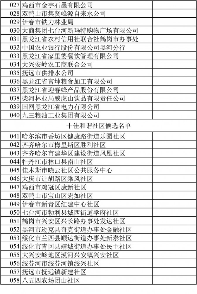 按照《关于组织开展第六届全省“六个十佳”和谐单位(家庭)创建评选活动的方案》安排,我们在全省组织开展以“弘扬社会主义核心价值观践行龙江优秀精神”为主题的社会主义核心价值观“六进”教育实践活动。为全面展示教育实践活动成果,发挥先进典型的示范引领作用,省委宣传部、省精神文明办、省直机关工委、省委高校工委、省总工会、团省委、省妇联、黑龙江日报报业集团、黑龙江广播电视台联合组织开展了第六届全省“六个十佳”和谐单位(家庭)创建评选活动。现将各地、各系统推荐并经组委会审定的十佳和谐机关、十佳和谐企业、十佳和谐校园、十佳和谐社区、十佳和谐村屯、十佳和谐家庭共120个“六个十佳”和谐单位(家庭)候选名单及简要事迹向社会公示,请广大干部群众积极参与、踊跃投票,从每个系列候选名单中评选出10个您心目中的“十佳和谐单位(家庭)”。
