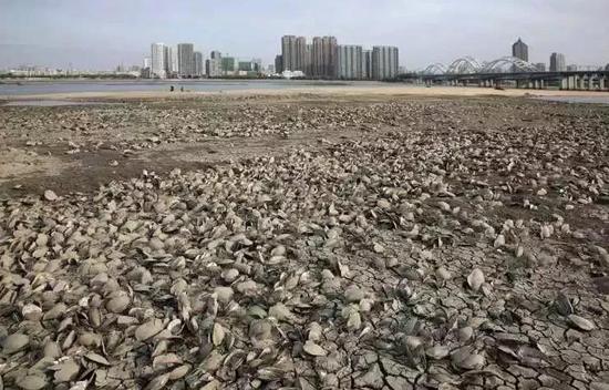 松花江哈尔滨段水位走低 露出大片滩涂搁浅的蛤蜊