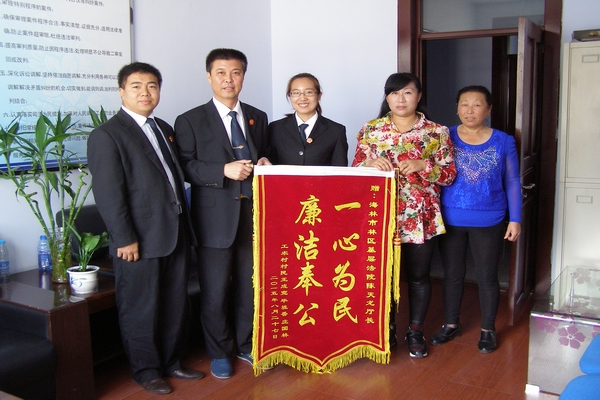 送锦旗的两位当事人是一起机动车交通事故赔偿案件死者家属王某、宋某,他们特地大老远从柴河林业局山上桦木林场赶到海林林区基层法院,亲手将一面写着“廉洁奉公,一心为民”的锦旗送到民事审判庭庭长陈天龙法官手中,不停地说:“感谢林区法院,感谢合议庭,感谢陈法官!保护了我们当事人的合法权益。”