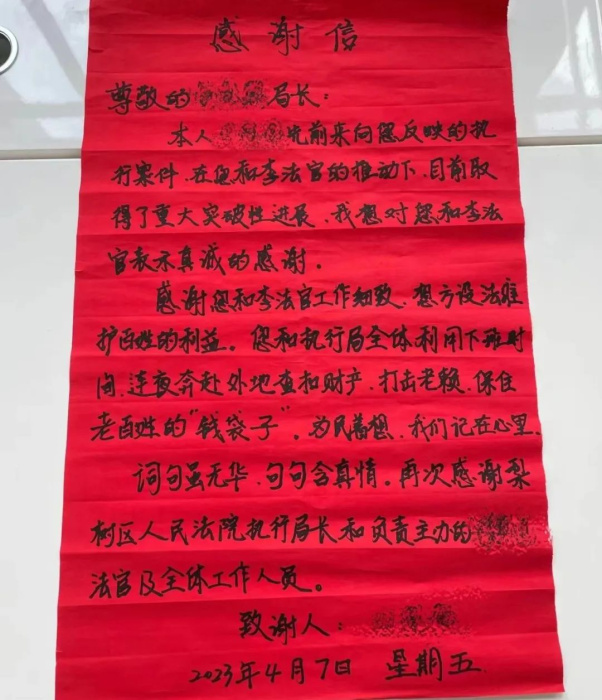 2023年4月10日,“煤城风暴”执行攻坚活动的第七天,梨树法院执行局收到了集中执行攻坚活动以来的第一封手写感谢信和两面锦旗,申请执行人用温暖的话语表达了自己的心意,握着执行干警的手连声感谢。