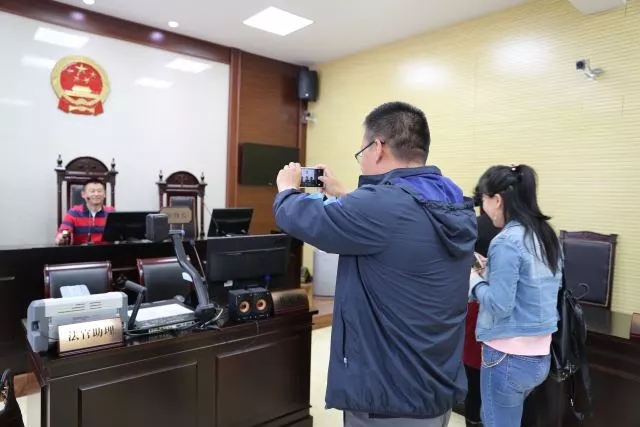 来到科技法庭,参观人员赞叹审判法庭庄严肃穆,他们坐在审判席前拍照留念,久久不舍离去。